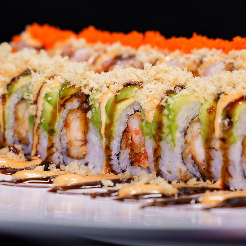 Shrimp tempura and avocado inside, topped with crab stick, eel sauce, spicy mayo, tempura flakes and wasabi dressing.