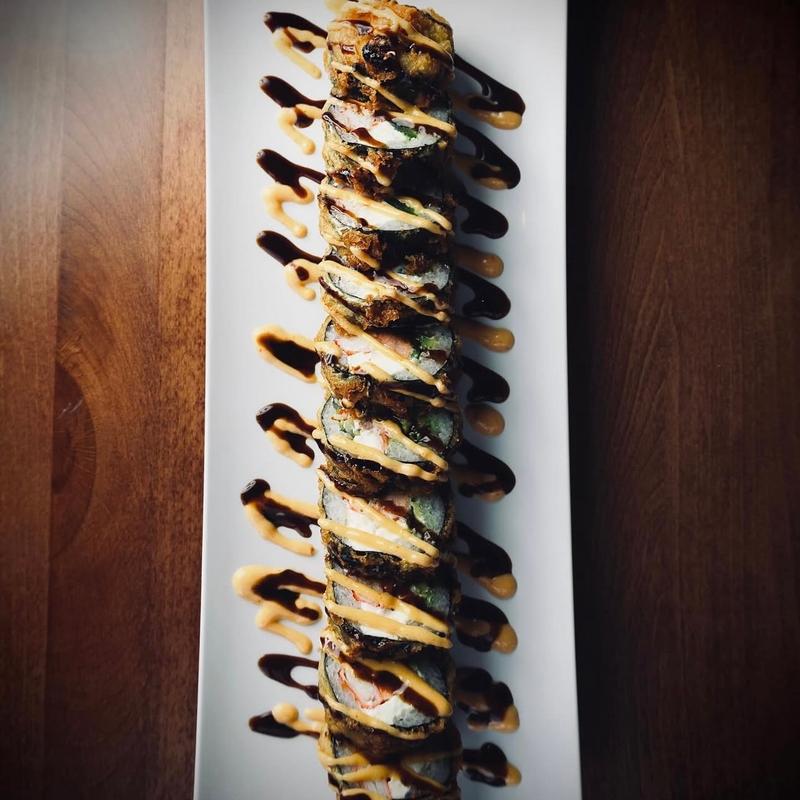 Deep fried spicy tuna mix, spicy crab, and avocado inside, topped with eel sauce.